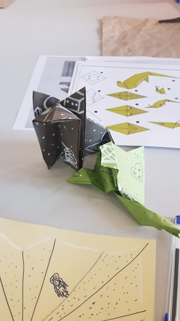 Après avoir croqué certains dessins sur les murs du box, les reproduire comme un motif sur le papier couleur, puis plier pour faire les origamis du renard, de l’oiseau mouche et du perroquet.