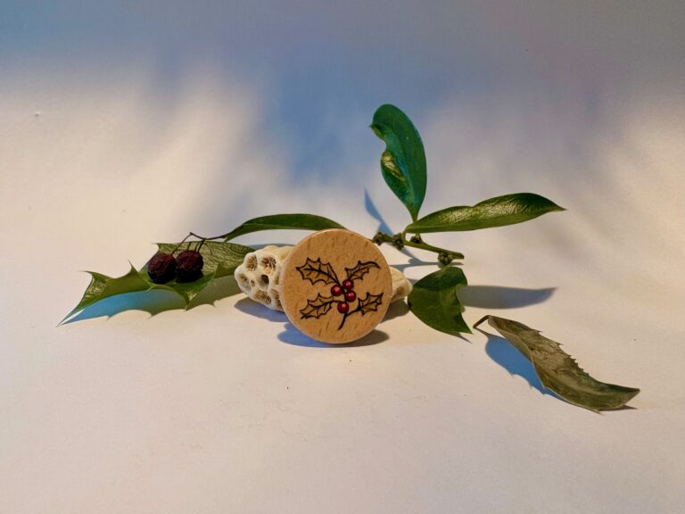 Broche aimantée en merisier motif feuilles de houx, diamètre 3 cm.
