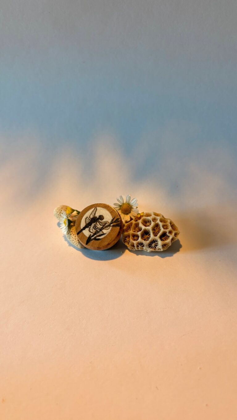 Broche aimantée en merisier motif libellule numéro 2, diamètre 3 cm.