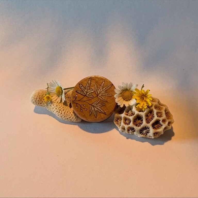 Broche aimantée en merisier motifs feuilles d’érable, diamètre 3 cm.