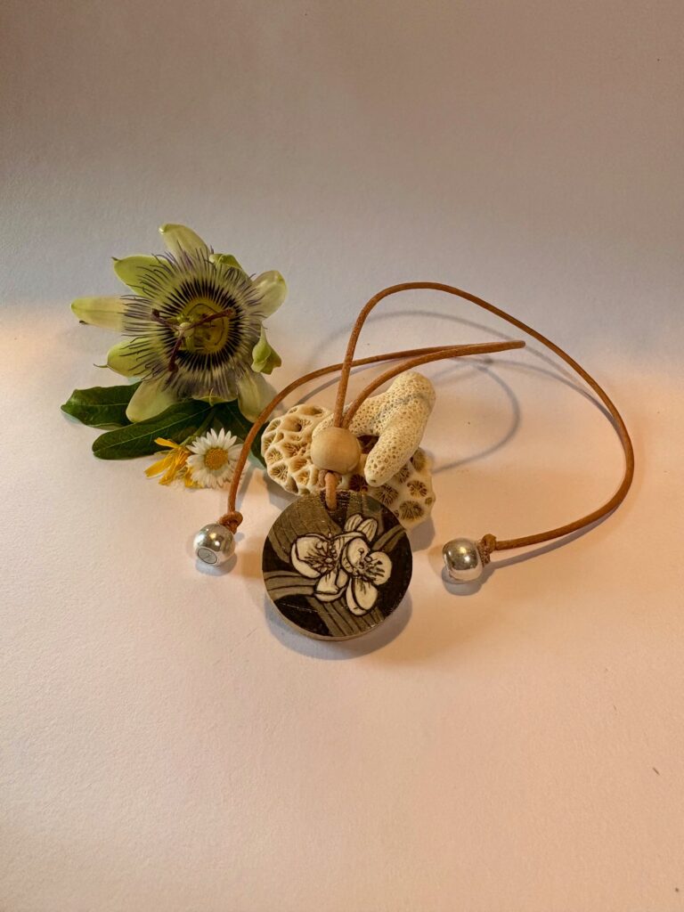 Collier Fleurs éphémères de Virginie avec perle en bois en lilas. Le médaillon est réalisé en bois de pommier.